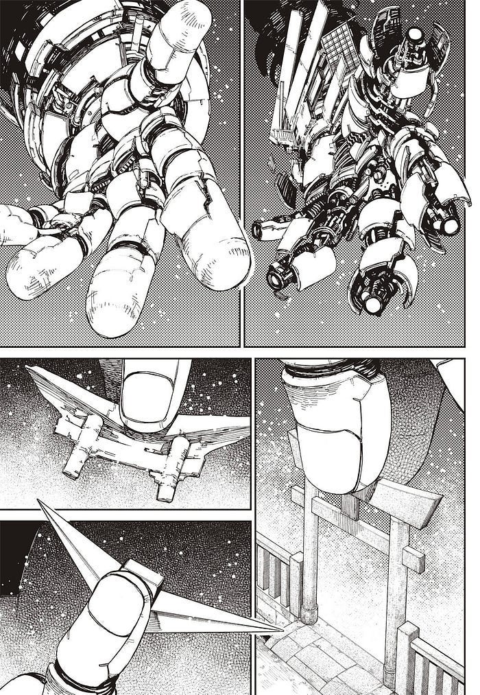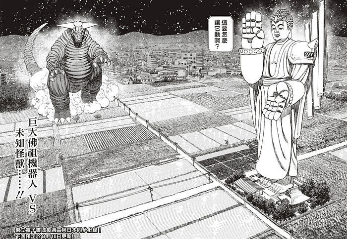 如果這還不夠,來看看大佛機械人這一幅,這種充滿特攝感的透視,讀者猶如坐直升機在大佛頭側45度一路望去遠方怪獸那樣。這是硬實力。