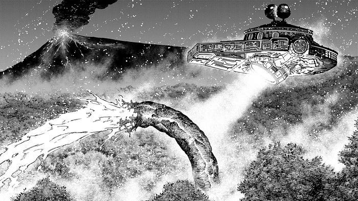 再說,他的劇情編排恐怕是Jump新世代漫畫裡面,近十年最好的腳本範例。他很擅長把小小的事件漸漸放大,例如起因於一家幾口的小事件,揭發當地邪教操弄信徒,而邪教崇拜的神明會引發火山爆發,火山的底部有一隻大boss。當大家以為事件告一段落,神明和大Boss都打敗了之際,作者突然插入一條Punchline。每個角色都有意想不到的用途,原本的壞蛋會反轉,變主角們的助力。嘔心惹人討厭的肥宅是唯一能操控外星科技的天才駕駛員。也可能被作者這種跳tone的重擊打得多,閱讀時才會有疲累感。卻又不得不承認,這種節奏感如果不是先天形成(感覺也不像),就是把大量資訊裝裡腦袋再融滙後精準輸出。感覺跟富樫有點像,不似是每一話臨時想到下一話怎麼畫的類型。