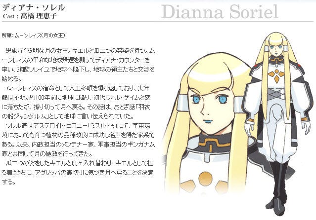 月之女王迪安娜隱居山林,過着平靜的生活。羅蘭守候在則。沒有人知道他們的關係,是戀人?朋友?君臣?看畫面,我更覺得羅蘭似是管家,或兩位相依為命的朋友。也沒有人知道Turn A 下落。我們甚知不知道,畫面上時間,距離決戰後多久了,可能是剛打完,也可能過了好幾年。